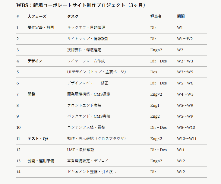 - 実務的なタスク: クロスブラウザ確認やドキュメント整備、引き渡しなど、見落とされがちな終盤のタスクが定義されている点は優秀です。