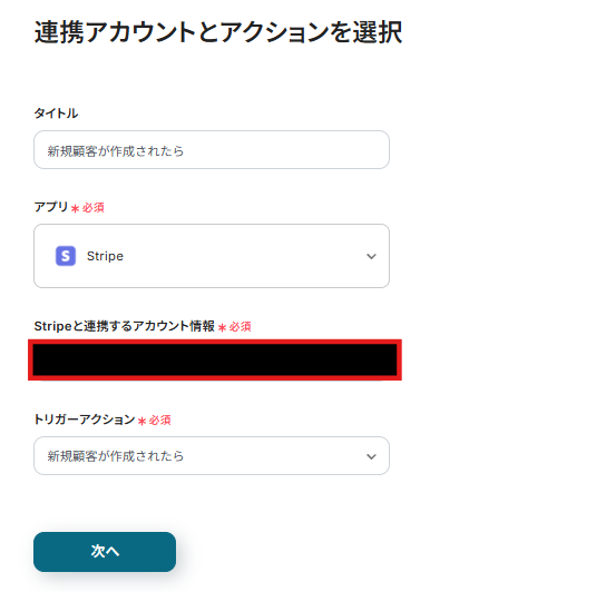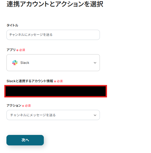 連携アカウントとアクションを選択する画面が表示されるので、今回連携するSlackのアカウントを確認し「次へ」をクリックします。