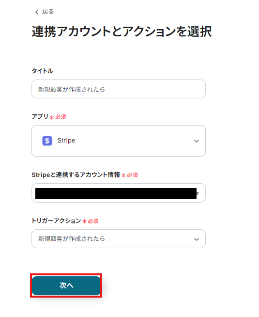 連携するアカウント情報には、ステップ1で連携したアカウント情報が反映されています。トリガーアクションはそのままにして、「次へ」をクリックしてください。