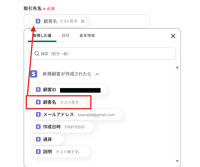 「取引先名」「担当者メールアドレス」は、入力欄をクリックして表示される取得した値から選択してください。