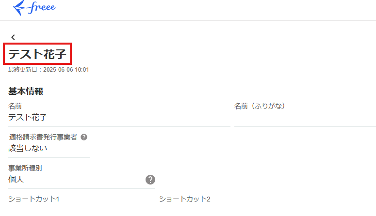 設定完了後は「テスト」を行い、実際にfreee会計に取引先が作成されることを確認してください。