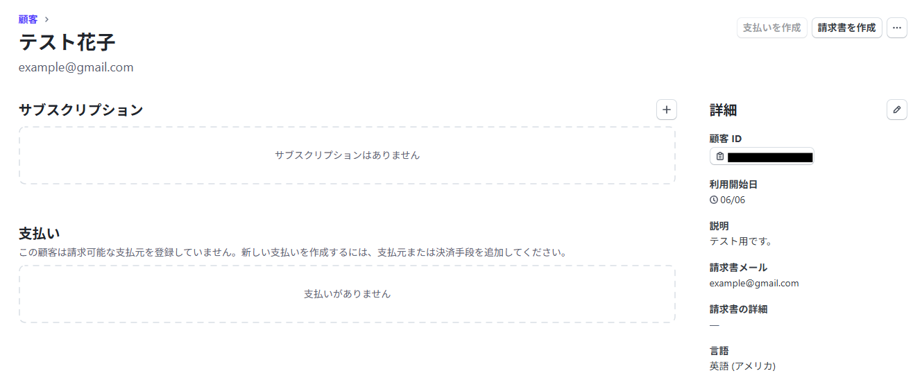 フローの作成を始める前に、あらかじめYoomと連携するStripeに、新規顧客を作成しておきましょう!