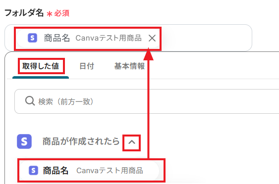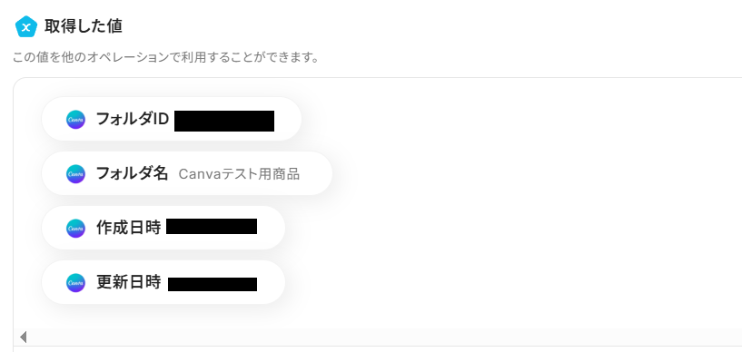 フォルダ名と親フォルダIDを設定できたら、「テスト」ボタンを押してみてください。取得した値に、Canvaで新しく作成されたフォルダの情報が反映されていれば成功です!