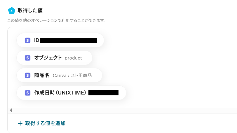 Yoomではこのデータを、フローボット内の他のアクションで活用できる「取得した値」と定義しています。 取得した値を活用を次のステップで活用することにより、CanvaにStripeのデータを自動反映可能となります!取得した値とは?