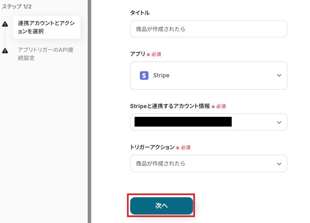 まずはタイトルを任意で設定し、Stripeと連携するアカウントやアクション内容を確認したら「次へ」を押してください。