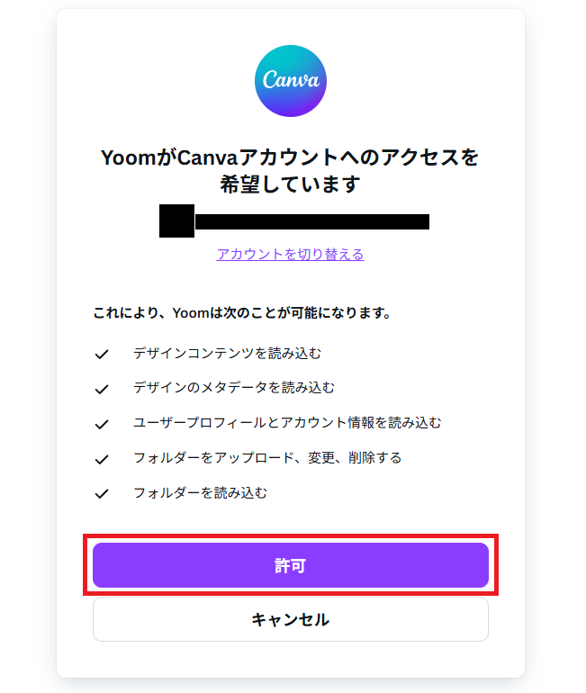 任意のアカウントでログインすると、YoomがCanvaに許可を求める以下の画面が表示されます。 必要に応じてアカウントを切り替えてから、「許可」をクリックしましょう。