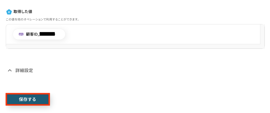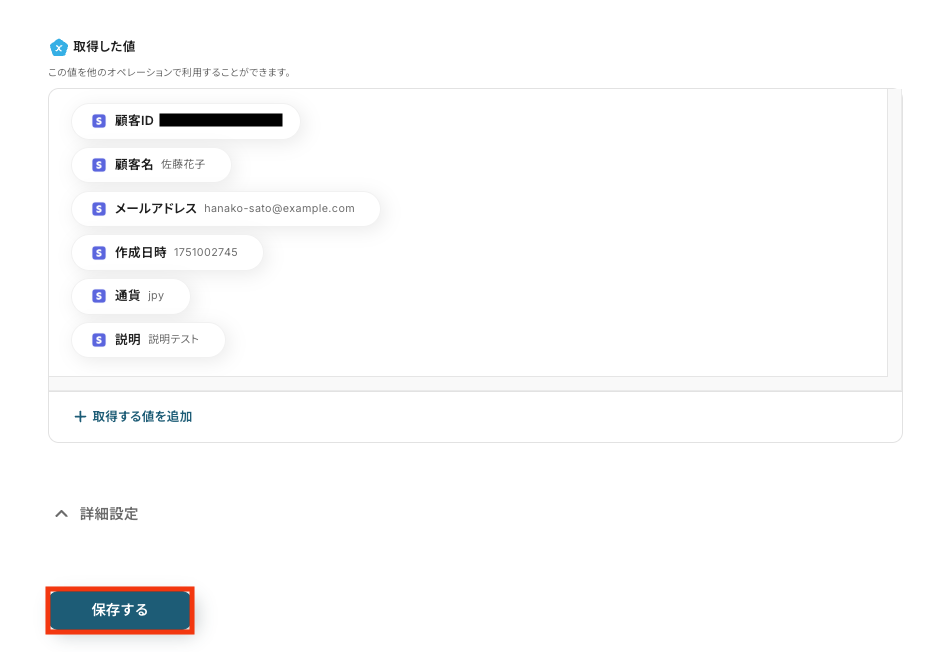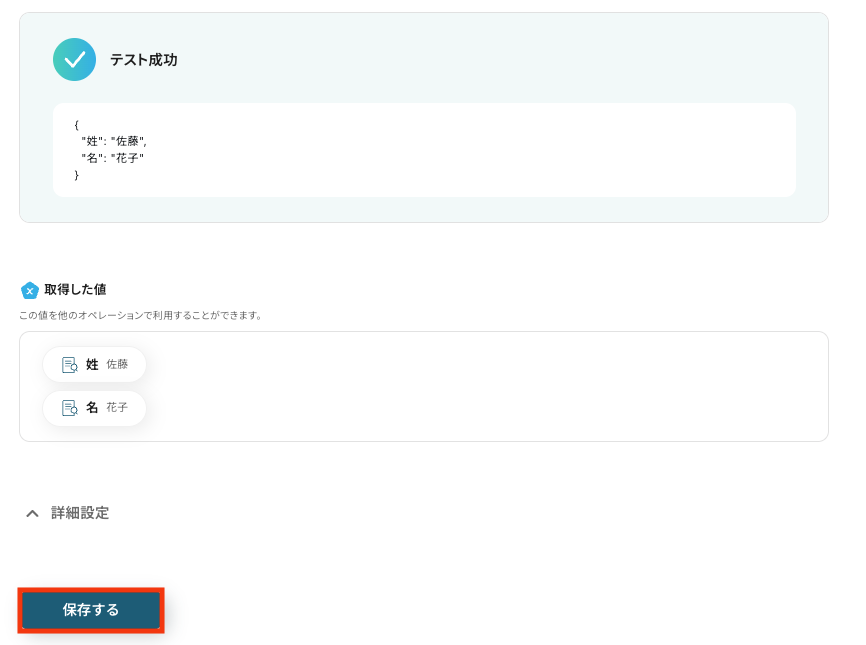 テストが成功したら、取得した値を確認し「保存する」をクリックします。