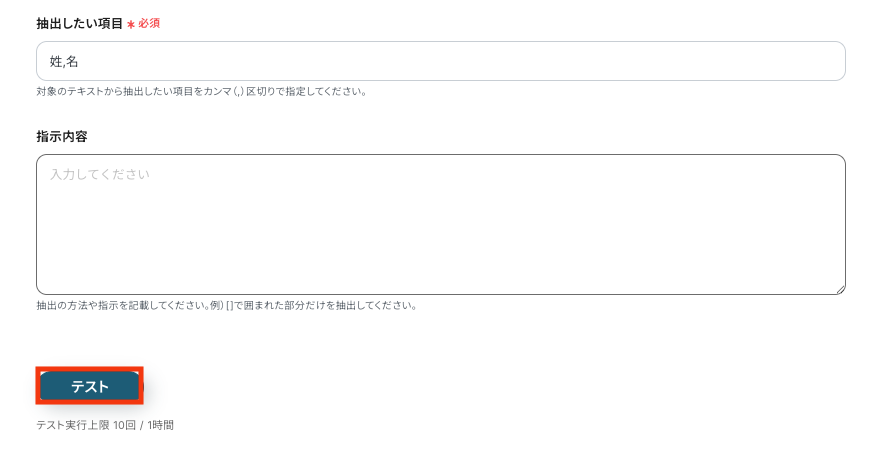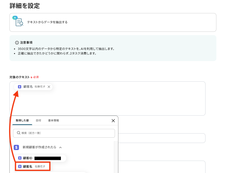 抽出したい項目には、作成された新規顧客情報から取り出したい情報をカンマ区切りで入力してください。