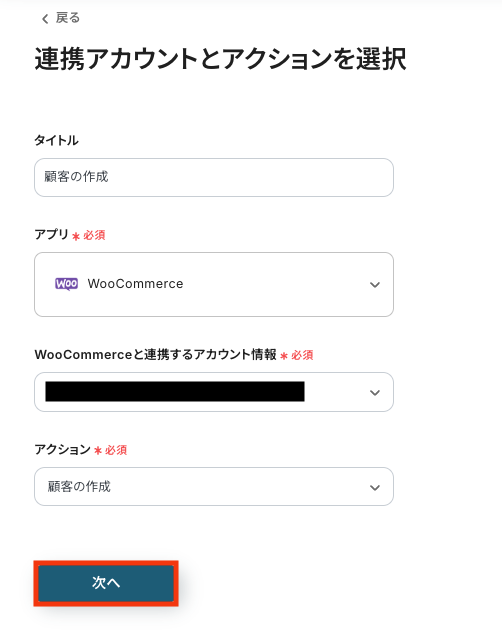 WooCommerceと連携するアカウント情報に問題がなければ、「次へ」をクリックします。