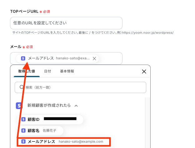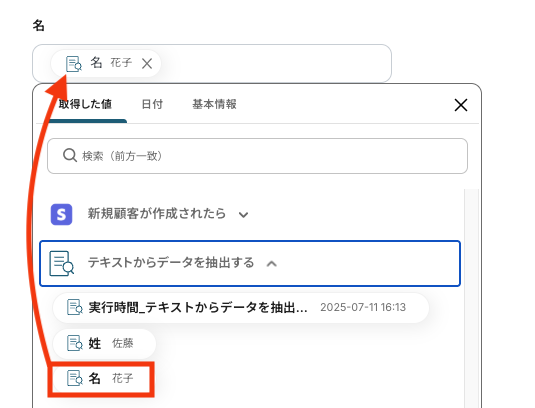 入力欄をクリックすると、前のステップで取得したアウトプットを選択でき、選択して入力可能です。