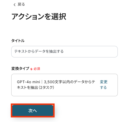 変換タイプ(GPT-4o mini|3,500文字以内のデータからテキストを抽出(2タスク)を確認し、「次へ」をクリックします。