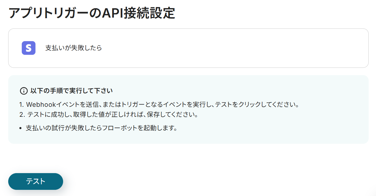 以下の画面が表示されるので、手順を確認して「テスト」→「テスト成功」→「保存する」をクリックします。
