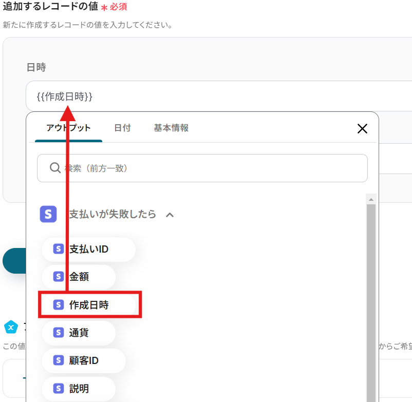 以下の画面が表示されたら、「追加するレコードの値」を設定してください。