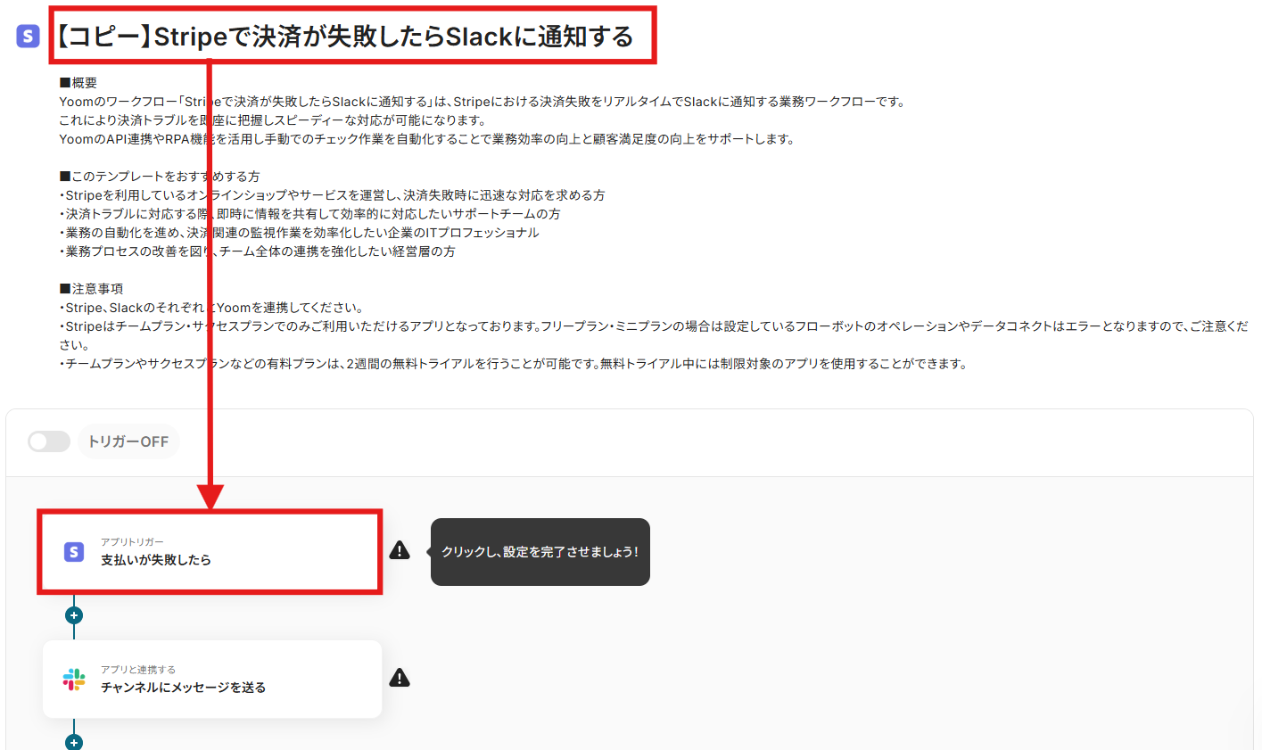 Yoomのワークフロー「Stripeで決済が失敗したらSlackに通知する」は、Stripeにおける決済失敗をリアルタイムでSlackに通知する業務ワークフローです。