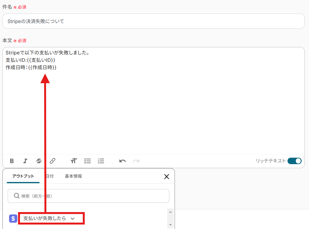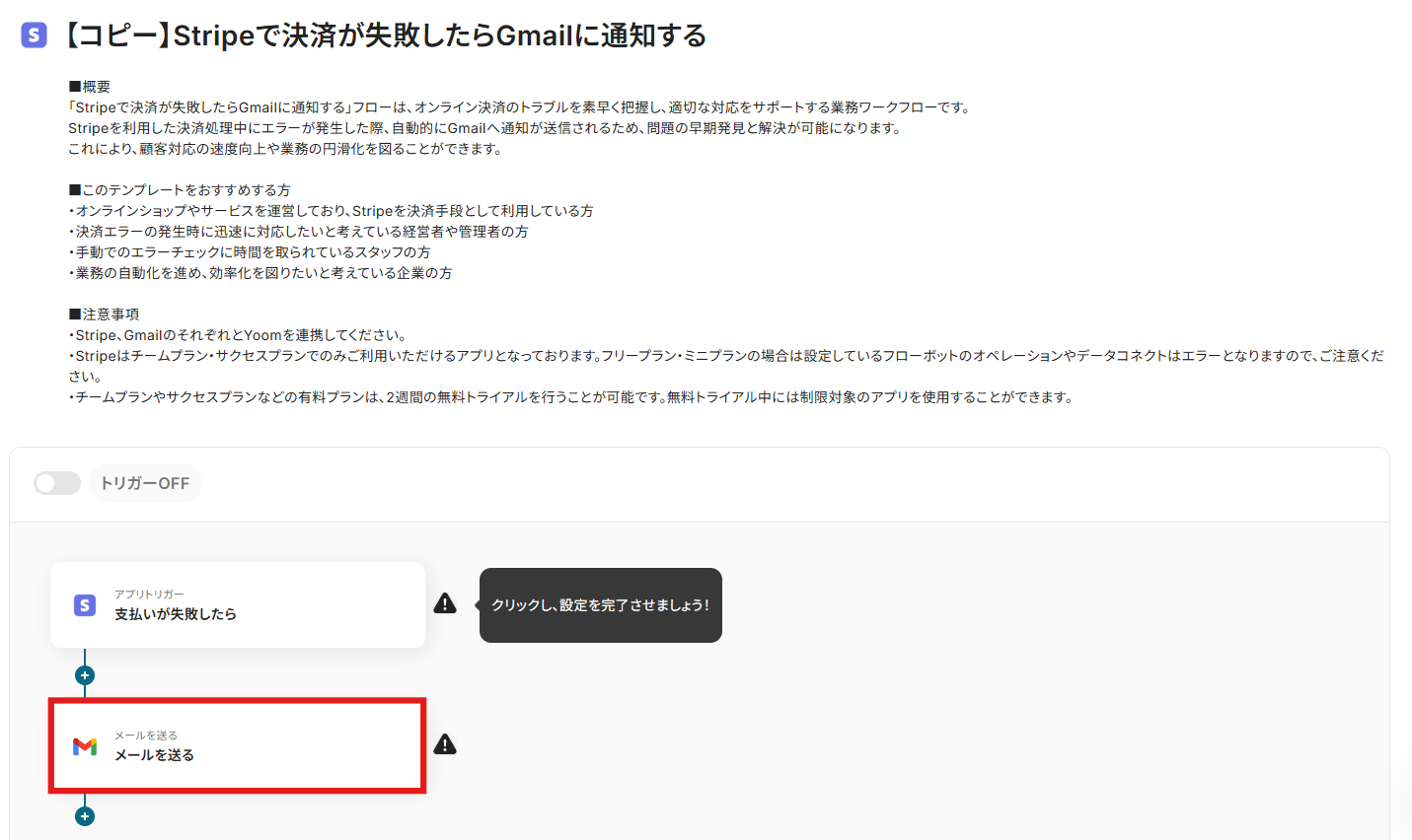 このワークフローを活用すれば、Stripeで決済が失敗した際に、その内容を自動でGmailに通知できます。