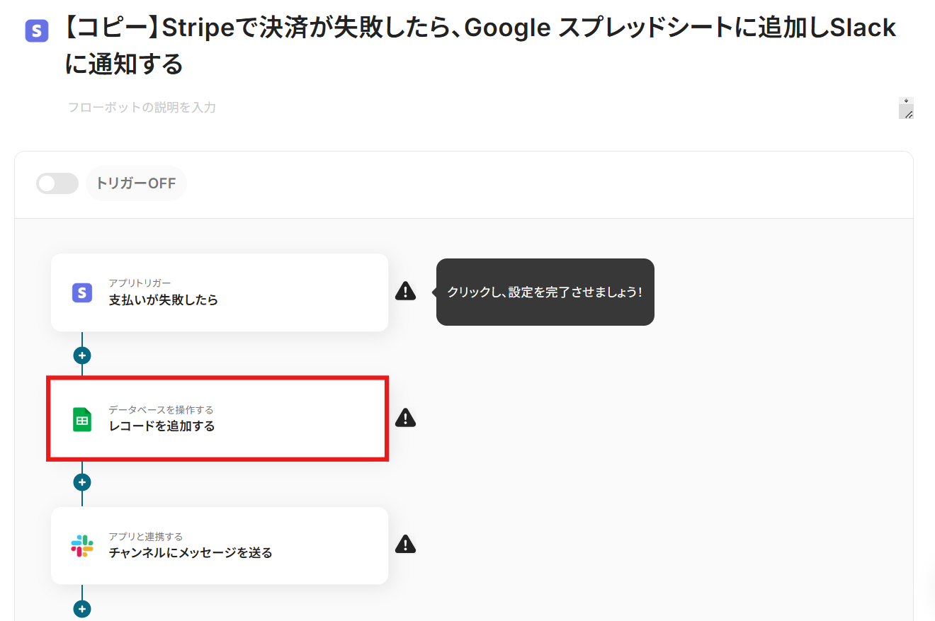 先ほど設定したテンプレートから派生して、こちらはStripeの失敗した決済情報をGoogle スプレッドシートに追加し、Slackに通知するフローとなっています。