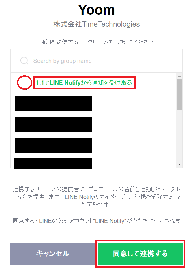 LINEに登録済みのトークルームが一覧表示されるため、Stripeで行われた支払いデータを受け取りたいルームを選択し、「同意して連携する」を押してください。