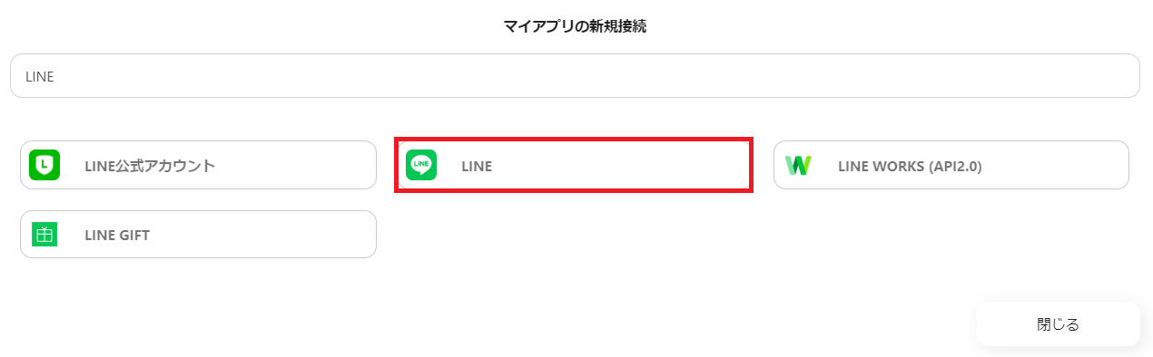 ※LINE公式アカウント、LINE、LINE WORKSの3種類があるため、ご注意ください。今回の連携で使用するのは「LINE」となります。