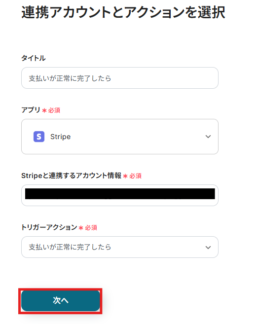 - 次に、トリガーでStripeを選択し、「支払いが正常に完了したら」というアクションを設定します。