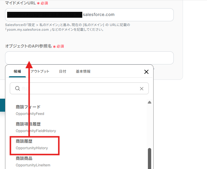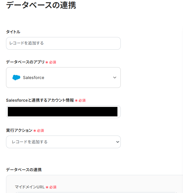 - Salesforceでレコードを追加するアクションでは、ご利用のSalesforce環境に合わせたマイドメインURLと、レコードを追加したいオブジェクトのAPI参照名(例:Opportunity、Accountなど)をそれぞれ指定してください。