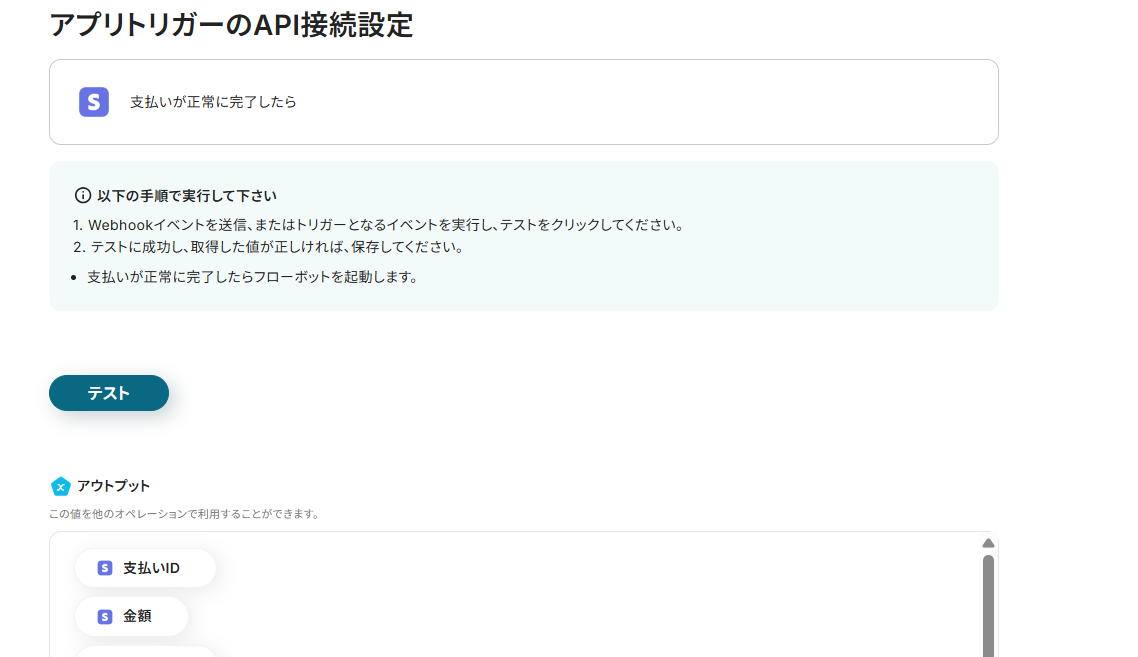 - Stripeのトリガー設定では、Stripe側で設定するためのWebhook URLが発行されますので、StripeアカウントのWebhook設定画面で登録してください。