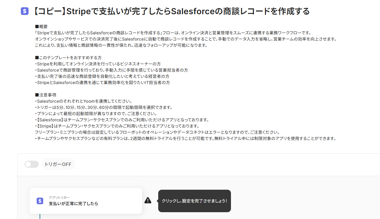 - Stripeのトリガー設定およびSalesforceのアクション設定