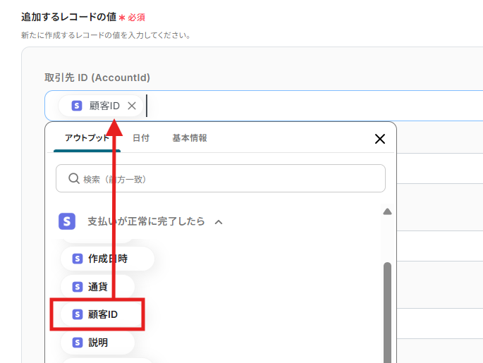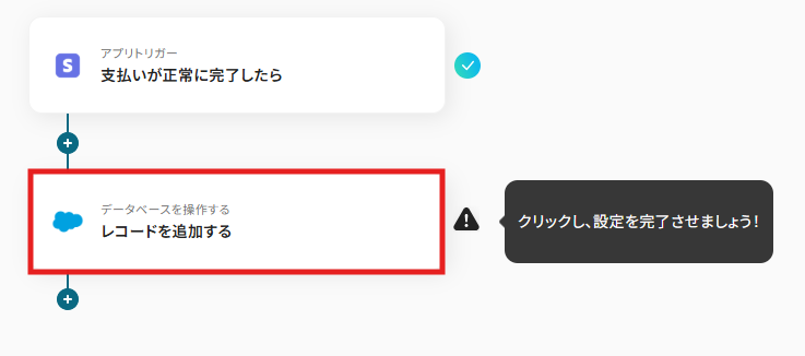 - 最後に、オペレーションでSalesforceの「レコードを追加する」アクションを設定し、トリガーで取得した支払い情報や顧客情報を任意の項目にマッピングします。