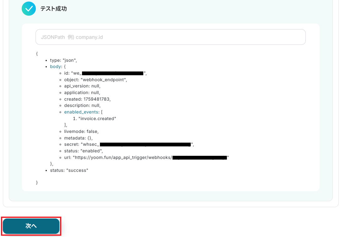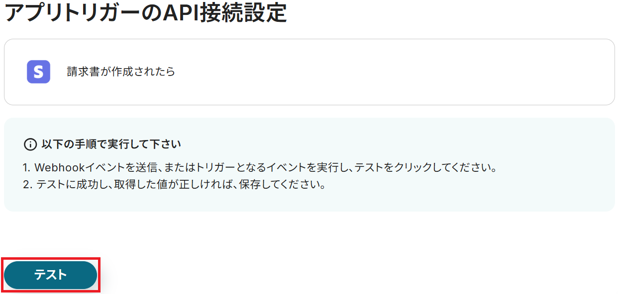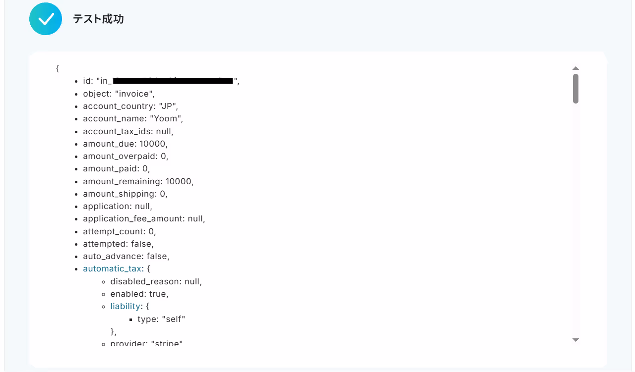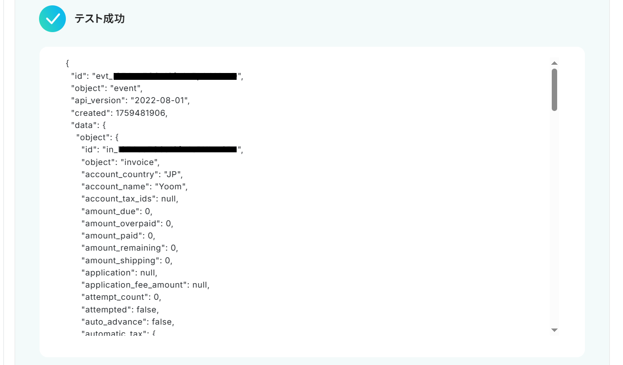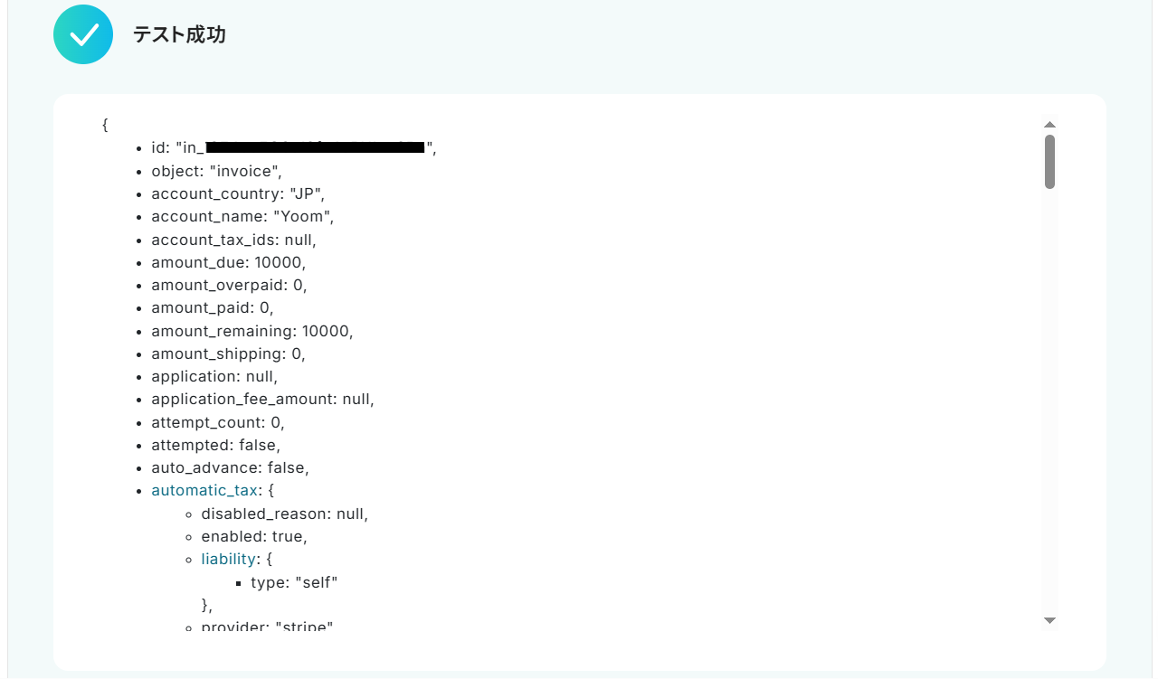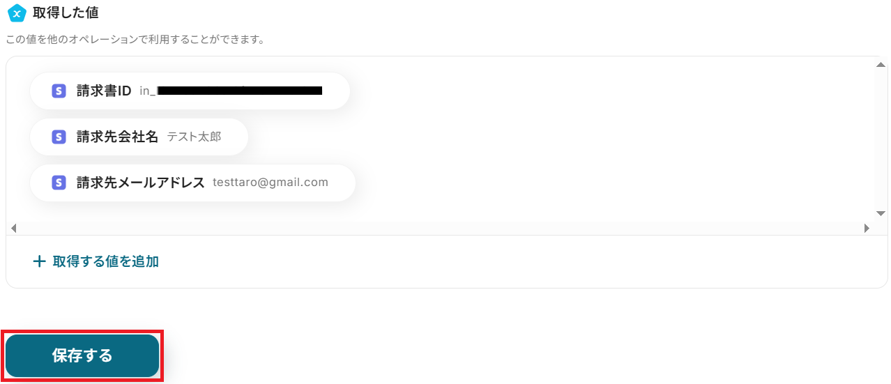 テストが成功するとテスト成功画面と取得した値が表示され、Stripeの請求書データが確認できます。「保存する」をクリックして完了です!