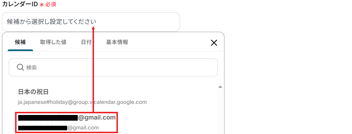 API接続設定に移るので、まず予定を登録するカレンダーIDを候補から選択しましょう。