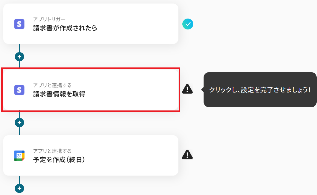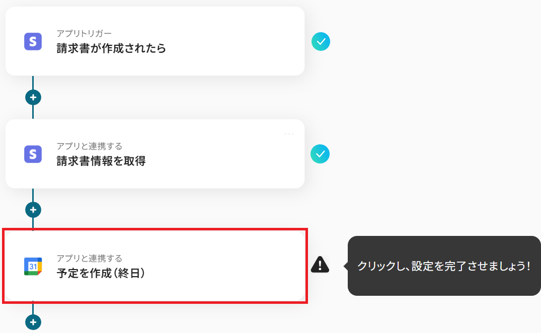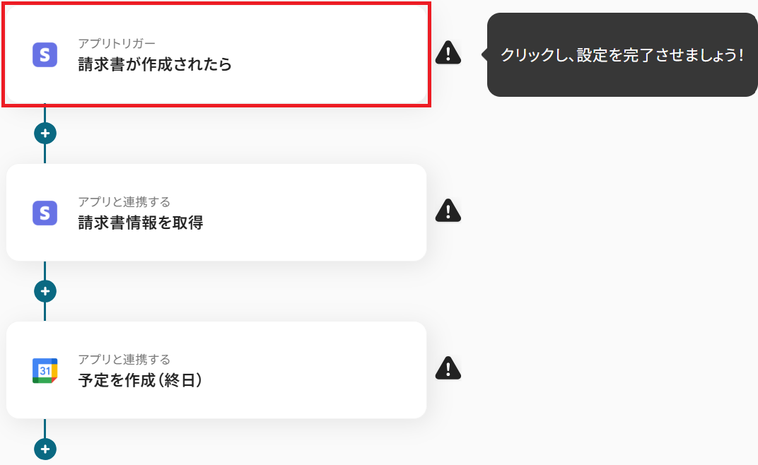 このワークフローを活用すれば、Stripeで請求書が作成されたタイミングをトリガーにして、Googleカレンダーへ自動で予定を作成できるため、請求関連業務の管理を効率化し、抜け漏れを防止します。