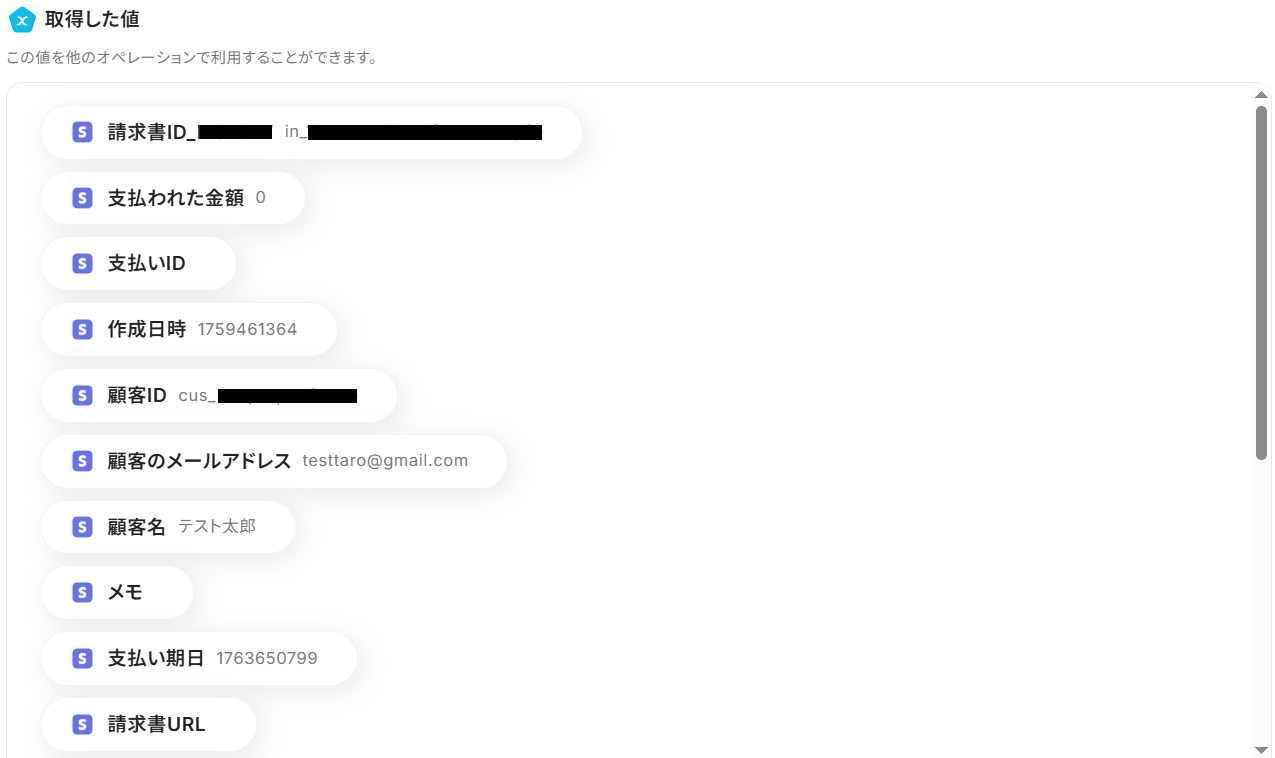 取得した値を設定することで、トリガーが実行されるたびに最新の請求書情報を反映できます。