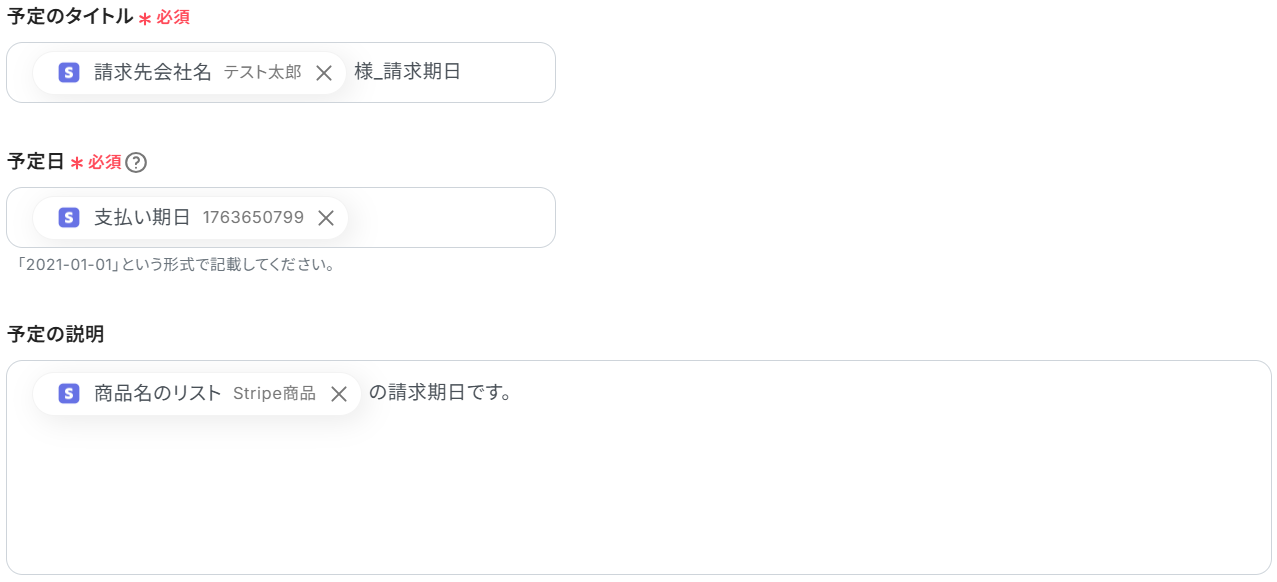 予定のタイトル・予定日・予定の説明には、ステップ4と同様にStripeから取得した値を選択します。
