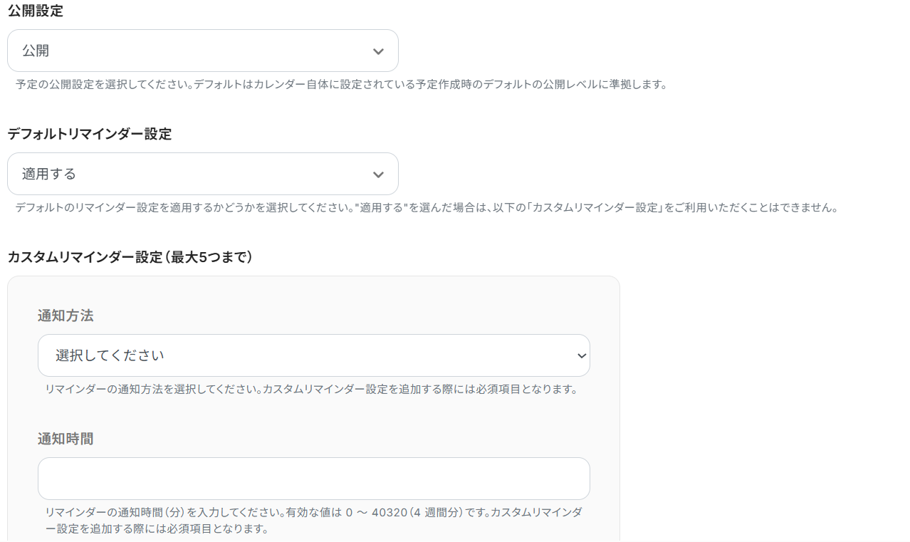 最後に、公開するか否か・デフォルトリマインダー設定をするか否かをそれぞれ任意で設定しましょう。