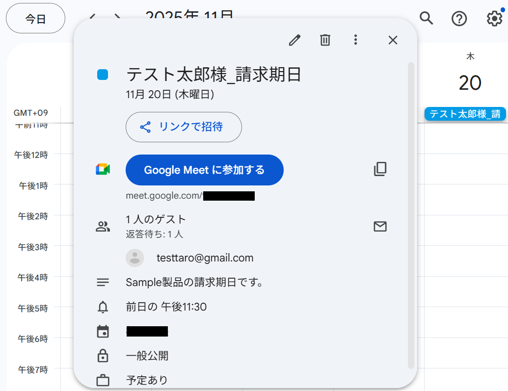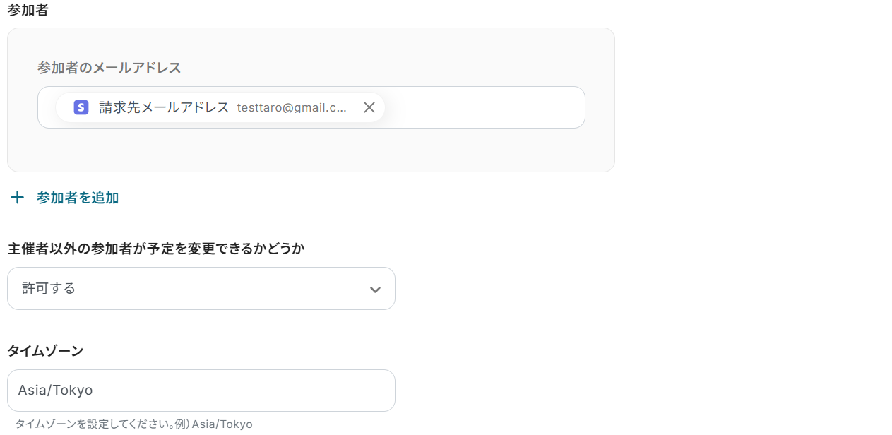 参加者の欄には「請求先メールアドレス」の値を設定したり固定のアドレスを直接入力したりできるので、予定を共有する相手に合わせて必要であれば指定してください。