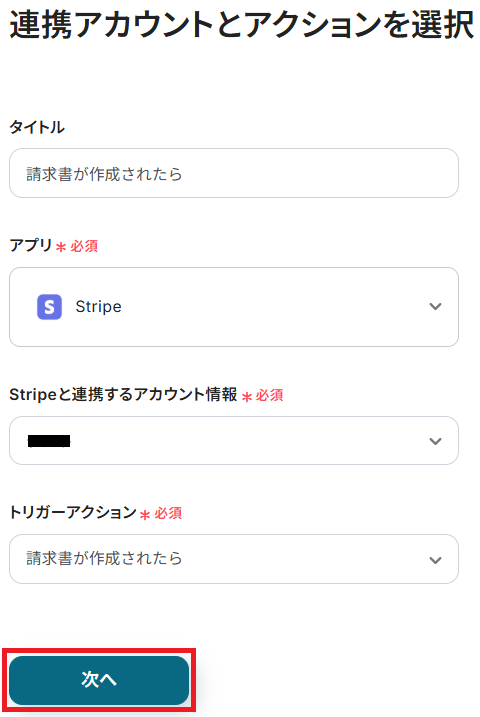 タイトルと連携するアカウント情報を任意で設定し、トリガーアクションはテンプレート通りに「請求書が作成されたら」のまま「次へ」をクリックします。