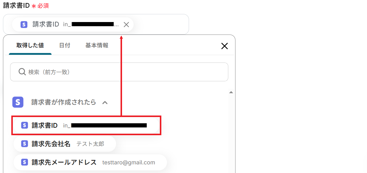 請求書IDの欄にはStripeの「請求書ID」を、画像のように取得した値を活用して入力していきます。