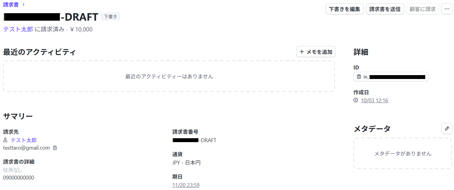ここまできたら一旦Stripeに移り、テスト用の請求書を登録します。