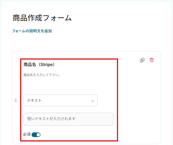 ※今回は、以下画像のような商品を作成しました。赤枠部分を設定に使用していきます。