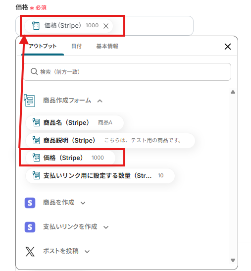 「価格」は、入力欄をクリックして表示されるアウトプットから選択してください。