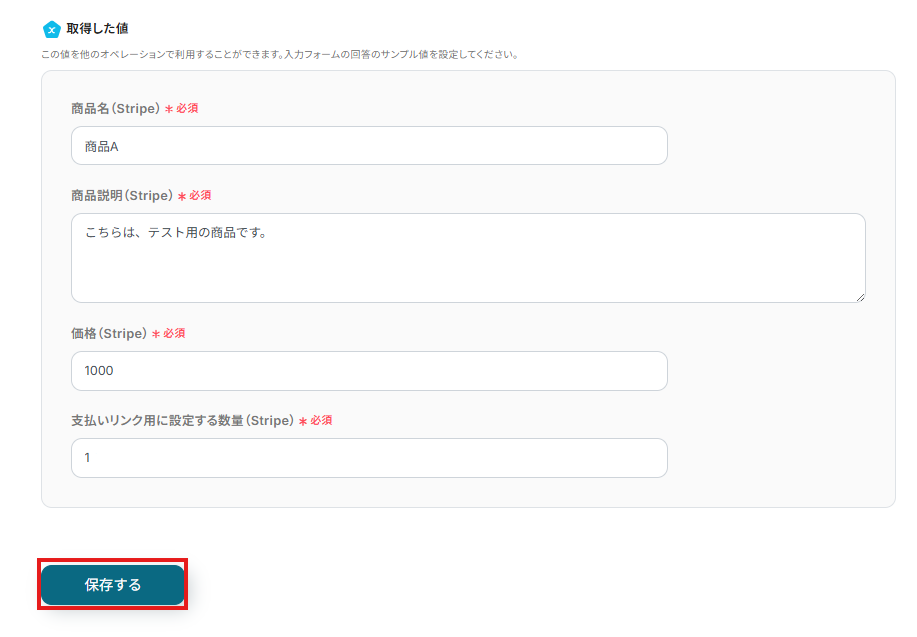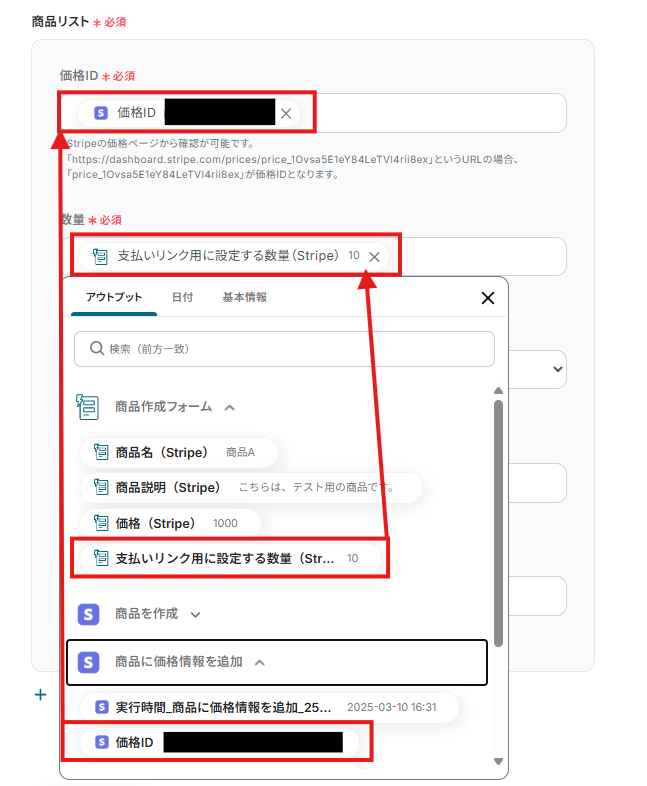 「価格ID」「数量」は、入力欄をクリックして表示されるアウトプットから選択してください。