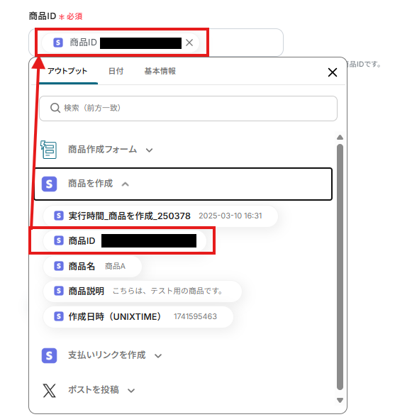 「商品ID」は、入力欄をクリックして表示されるアウトプットから選択してください。