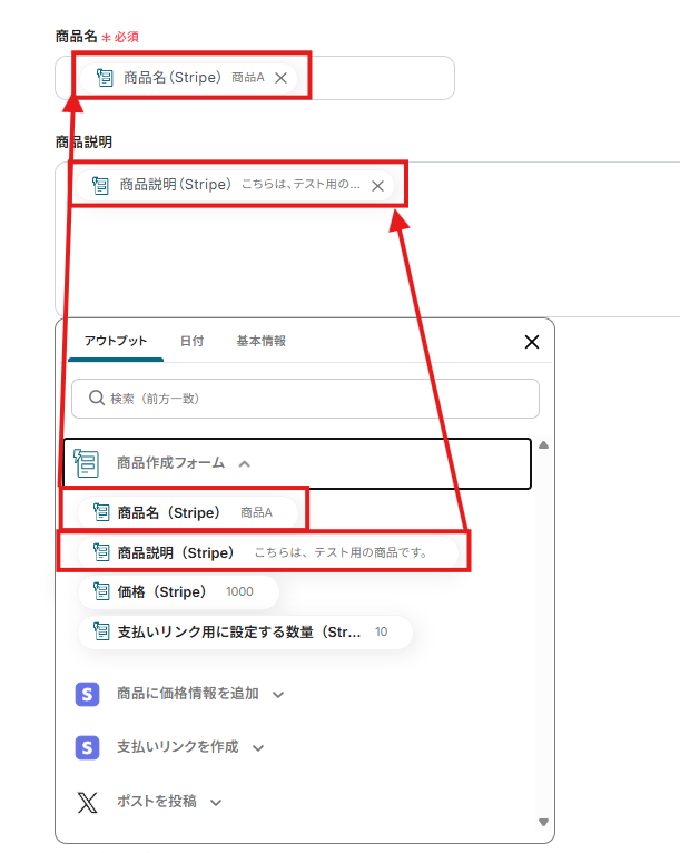 「商品名」「商品説明」は、入力欄をクリックして表示されるアウトプットから選択してください。