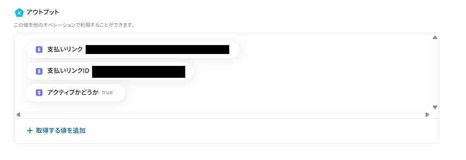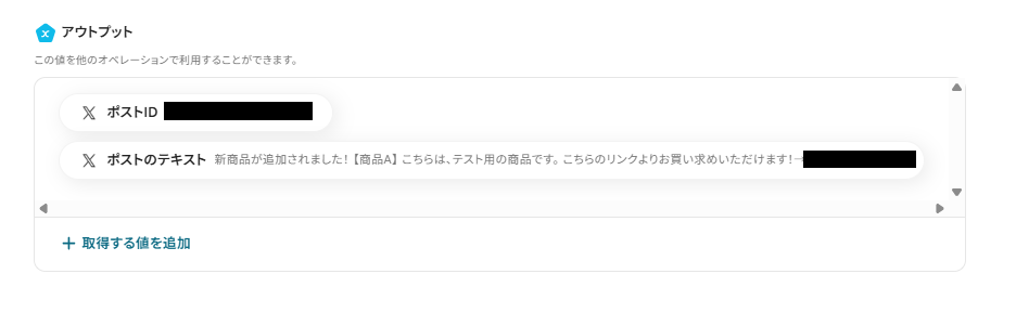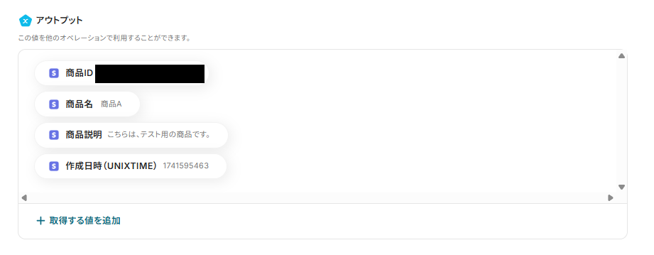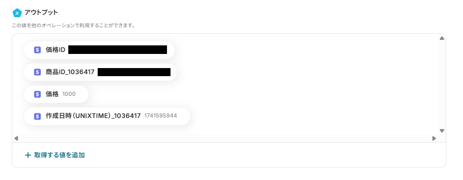 ※表示されているアウトプットは「この値を他のオペレーションで利用することができます。」と表記があるように、次の設定でも活用できます。