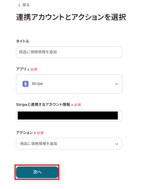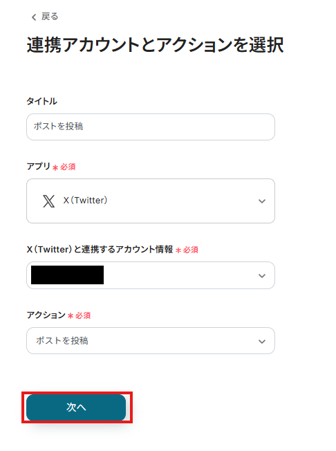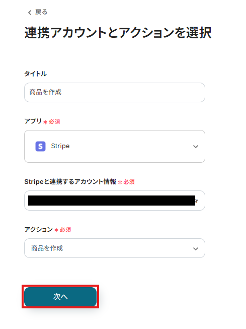 表示された画面で必須項目を入力し、「次へ」をクリックします。