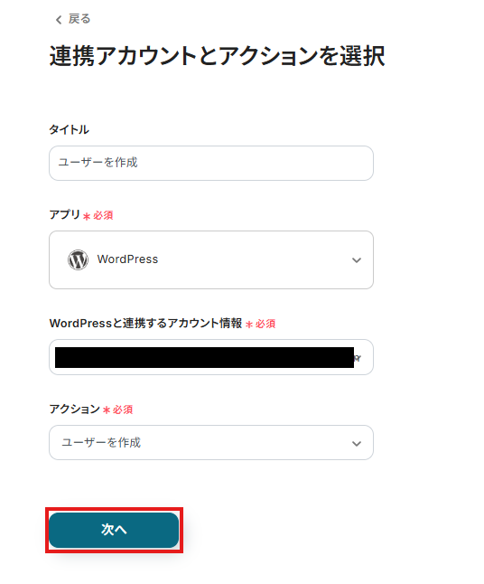 ※今回はWordPressのユーザーIDを生成するために、こちらの設定を行うため、以下画像のように入力しました。