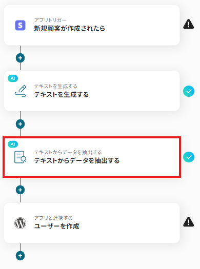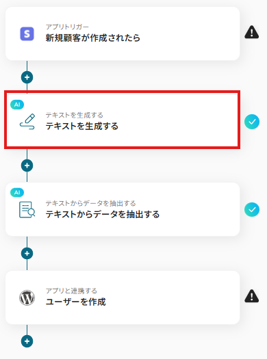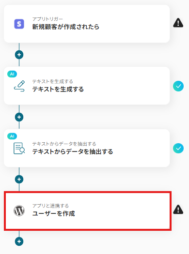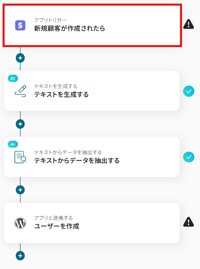 ※以下の画面は、Yoomページ画面左側「マイプロジェクト」のフローボットで表示される、「【コピー】Stripeで新規顧客が作成されたらWordPressにユーザーを自動登録する」をクリックすると表示されます。