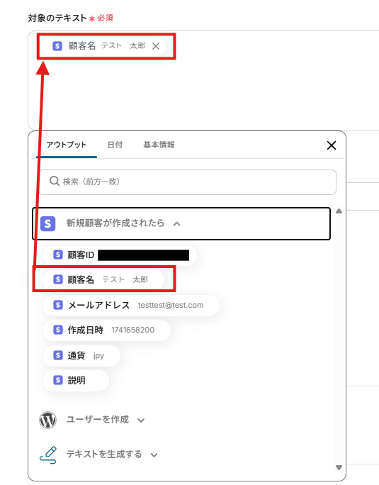 2.「対象のテキスト」は、入力欄をクリックして表示されるアウトプットから選択してください。