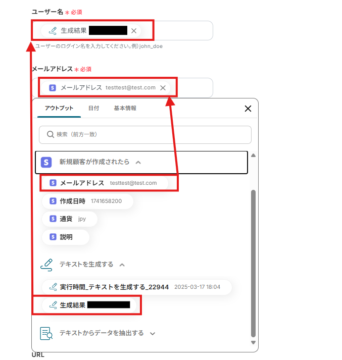 「ユーザー名」「メールアドレス」「名」「姓」は、入力欄をクリックして表示されるアウトプットから選択してください。