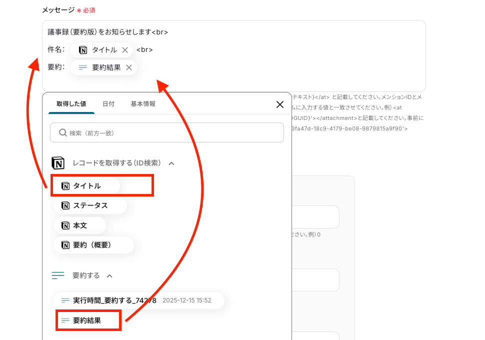 - Microsoft Teamsへ通知する際のメッセージ内容は、要約結果やNotionのページ情報などを組み合わせて自由に作成可能です。