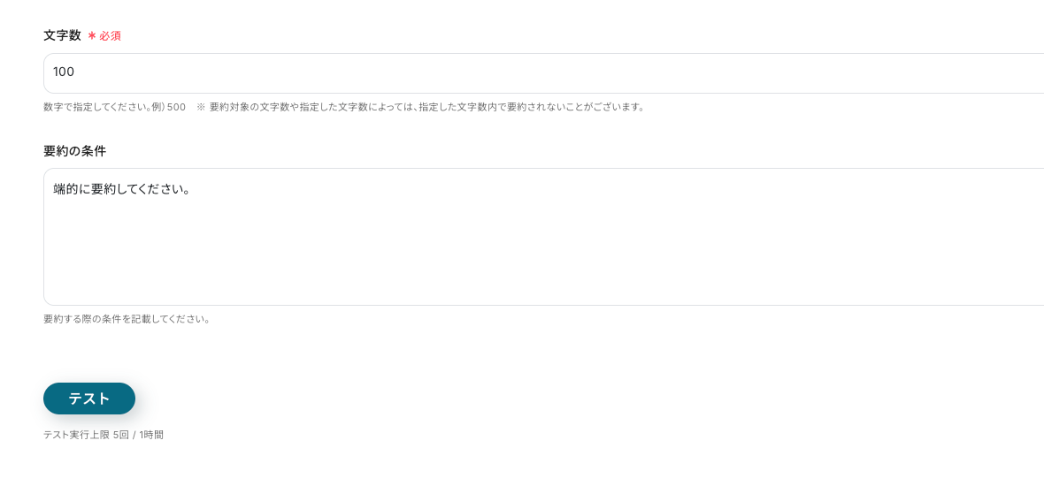 テンプレートの設定により数字が指定されていますが、文字数などに希望がある場合は編集し、テストボタンを押しましょう。